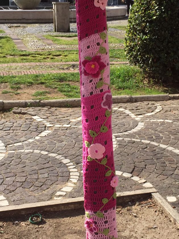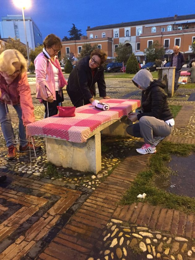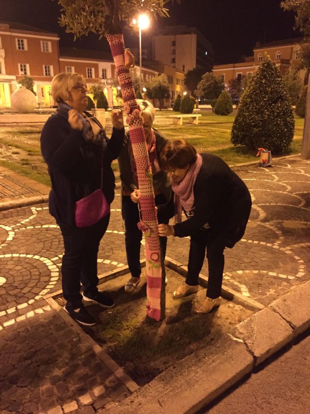 Uno yarn bombing o bombardamento di filato, in piena regola. Un lavoro che negli ultimi tre mesi le ha viste impegnate a realizzare strisce lavorate a uncinetto o ai ferri, da girare intorno ai tronchi degli alberi così da poterli ricoprire di filo colorato, tricottando con velocità e perfezione i vari punti della maglia, rasata a diritto o rovescio, lenta o legaccio, punto rete, maglia alta e bassa per le roselline da far spiccare sui verdi arbusti e maglia tessuto per le copripanchine in marmo a cui hanno aggiunto le scritte “Lilt” e “Latina”.