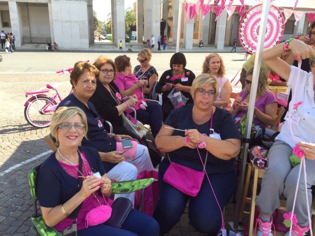 A giugno, dopo aver acquistato a loro spese oltre 5 chili di filato rosa e aggiunto quello che avevano già in casa, hanno lavorato per l’“addobbo” della piazza in rosa. E’ la prima volta che accade una cosa del genere. Non solo a Latina. Ma in Italia. Finito di allestire non si sono fermate. Erano ancora lì, sotto il gazebo che la Lilt ha allestito in piazza a sostegno della prevenzione nella lotta al cancro, a lavorare. Anche se è domenica. Hanno creato dei braccialetti rosa per finanziare ancora la Lilt. Intorno i mariti premurosi e pazienti. E la gente che si ferma a guardarle. Un’operazione di volontariato davvero unica.