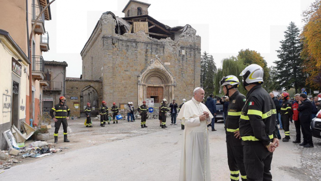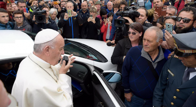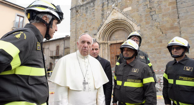 Bergoglio, accompagnato dal vescovo di Rieti, Domenico Pompili, ha raggiunto a bordo di una utilitaria la zona rossa e accompagnato dai Vigili del fuoco si è incamminato lungo uno delle vie principali, Corso Umberto I. Papa Francesco ha tenuto il suo discorso con un piccolo microfono con altoparlante.”Vi sono vicino e prego per voi”, rivolgendosi ai terremotati.