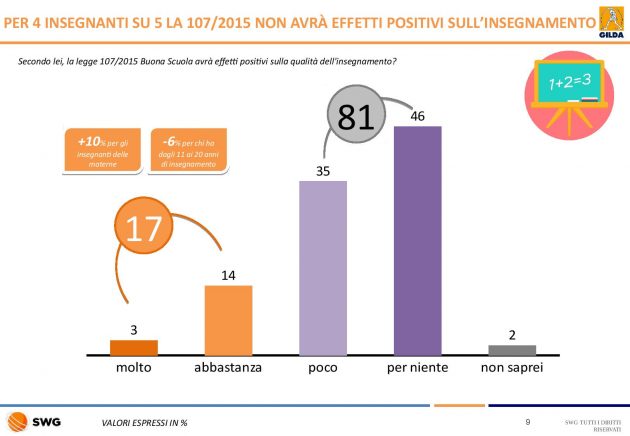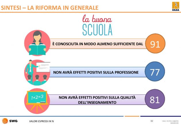 La ricerca, intitolata “Un anno di Buona scuola: la riforma all’esame degli insegnanti”, è stata commissionata dal sindacato Gilda e presentata in occasione della giornata mondiale degli insegnanti. I pareri sulla Legge 107, quasi tutti negativi, non sono una sorpresa. Più sorprendente, invece, la severità con cui i docenti valutano in maniera unanime tutti i punti della riforma (su cui il 91% afferma di essere ben informato, a dimostrazione di quanto il dibattito abbia coinvolto la categoria negli ultimi mesi). Il giudizio negativo riguarda infatti innanzitutto la “Buona scuola” nel suo complesso: non servirà a migliorare l’insegnamento, e secondo il 77% degli intervistati non ci saranno effetti positivi neppure per la professione dei docenti.