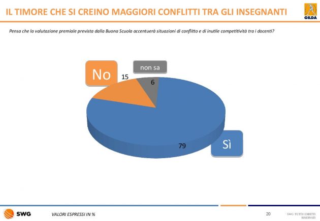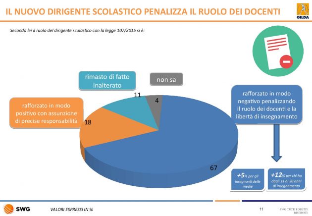 Ma dalla chiamata diretta alla valutazione, passando per il super-preside, praticamente tutti i punti principali su cui si articola la riforma vengono bocciati. Persino il bonus di merito, che in teoria dovrebbe tradursi in un aumento in busta paga per i docenti (almeno per i più bravi di essi): il 67%, però, non condivide questa forma di premio, e addirittura il 79% è certo che causerà “situazioni di conflitto e di inutile competitività” all’interno delle scuole. Ovviamente negativo il giudizio sul “super-preside”, una delle figure più temute e contestate della riforma: per il 67% il ruolo del dirigente scolastico si è rafforzato pericolosamente e penalizzerà i docenti.