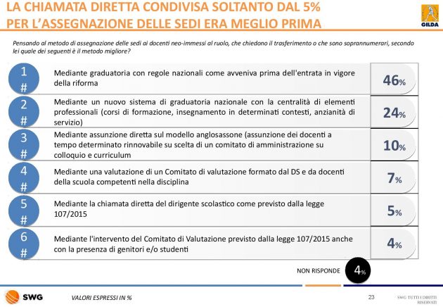 Come del resto la chiamata diretta, la possibilità per i presidi di scegliere direttamente tramite colloqui i propri insegnanti all’interno di un albo territoriale: appena il 5% approva il nuovo meccanismo di selezione; il 70% avrebbe preferito restare al vecchio sistema delle graduatorie nazionali, al massimo (per il 24%) modificato secondo criteri più moderni. Nel malcontento generale, sembra salvarsi solo l’obbligo di formazione continua per i docenti, che trova d’accordo in linea di principio il 75% degli interessati; anche se la maggior parte (il 55%) ritiene che dovrebbe accompagnarsi a degli aumenti stipendiali e alla definizione di un nuovo contratto di lavoro.