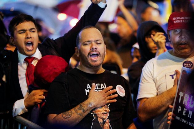 I testimoni descrivono l’atmosfera di queste ore, nella Trump Tower, sede della campagna del candidato repubblicano (sotto la quale in queste ore si sono radunati i suoi sostenitori, nelle foto), come “confusa e abbattuta”. La crisi più devastante, per Trump, esplode infatti a poche ore dal dibattito. L’abbandono di molti pezzi grossi del G.O.P. si fa sentire. Lo stesso vice, Mike Pence, si è defilato. “Non ci sta a fare da scudo umano per Trump”, dice un funzionario repubblicano. L’esplosione del caso sulle frasi sessiste ha mandato all’aria anche quel poco di preparazione che un candidato come Trump, abituato a improvvisare, aveva accettato. I principali consulenti del tycoon, Steve Bannon, Kellyanne Conway, il genero Jared Kushner, procedono in ordine sparso. L’atmosfera, appunto, è di confusione; di aperta crisi.