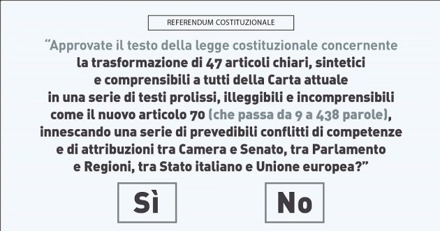 Cosa significa realmente il testo del referendum su cui i cittadini saranno chiamati a votare? Ripubblichiamo qui la “traduzione” del quesito apparsa sul Fatto Quotidiano dell’11 ottobre.