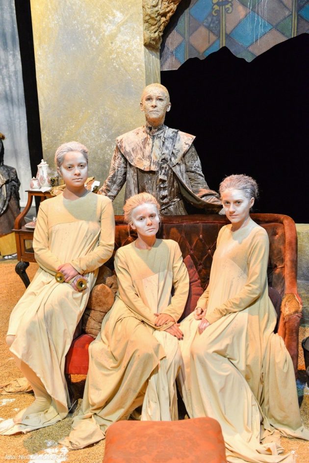 In questo quadro fortemente connotato da bellezza celeste e brutture terrene tre donne si aggirano, ancelle-fantasma, mute, svuotate, cariche di domande silenziose inevase (preparate dall’aiuto regia Silvia Pasello; infatti ricordano le tre sorelle il Lear sempre a cura del regista pisano con i sandali grotowskiani), zombie eteree e sporche la cui presenza è colma, per niente indifferente, assai inquietanti, simili ai soldati cinesi di terracotta, si muovono in punta di piedi, lievi e tacite.