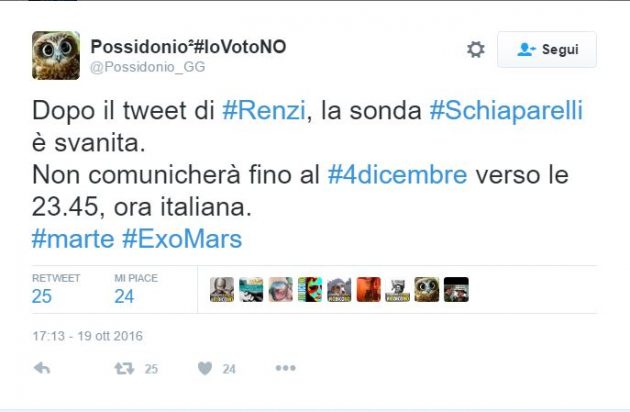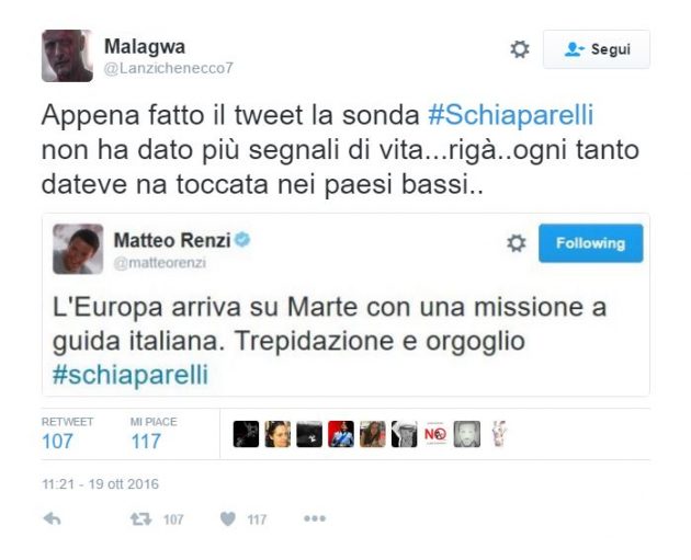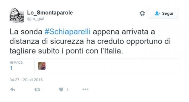 Dopo la notizia della caduta di Schiaparelli sul suolo di Marte, su Twitter non sono mancati commenti e immagini. Molti utenti in maniera ironica hanno commentato il “suicidio” della sonda.