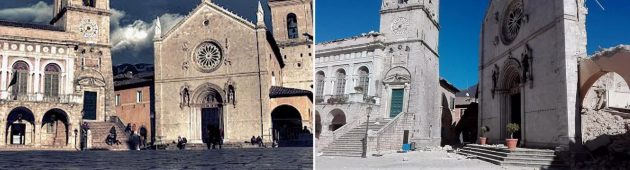 Il municipio e la Basilica di San Benedetto a Norcia prima e dopo la scossa