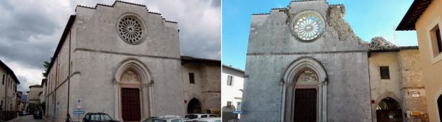 L'auditorium ed ex chiesa di San Francesco a Norcia prima e dopo la scossa