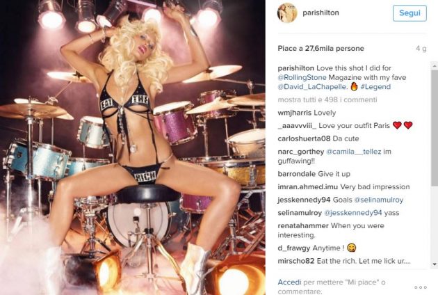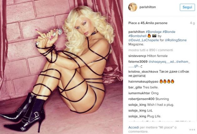 Di Paris Hilton non si parla più granché: perfino i settimanali scandalistici sembrano aver perso interesse per la ricca ereditiera. Lei, c’è da scommetterci, non è tipo di abbandonarsi all’oblio: sarà per rinverdire l’attenzione nei suoi confronti che ha postato sul suo profilo Instagram la nuova copertina di Rolling Stone che la vede protagonista? La trentacinquenne è stata immortalata da LaChapelle in una posa sexy e “vestita” solo del lungo filo di un microfono: una Paris versione “bondage” che ha entusiasmato i suoi fan. Ci sarebbe da chiedersi chi siano i fan della bella Paris, professione ereditiera. Lei, intanto, sponsorizza una nuova linea di profumo e si gode l’ingresso nella sua vita del “nuovo” chihuahua, pagato la bellezza di ottomila dollari.