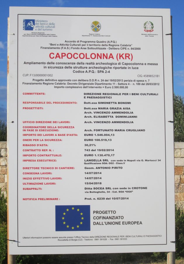 Con lunghi fermi. Ma non è questione di risorse insufficienti. Esiste l’intervento Spa 2.4 “Capocolonna (Kr). Ampliamento delle conoscenze della realtà archeologica e messa in sicurezza delle strutture archeologiche riportate in luce” finanziato con le risorse del Fas, per un importo di 2.500.000 di euro. Progetto ripensato nelle modalità, interessato da due varianti, ma senza cambiare le cifre. Eppure i mosaici sono in attesa degli interventi previsti, così come la porticus affacciata sul foro.