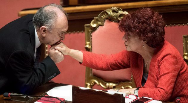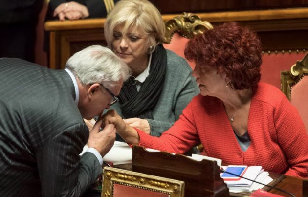 Baciamano numero 1 al ministro Fedeli: il capogruppo al Senato di Ala Lucio Barani, noto cavaliere che infatti una volta fece il gesto della fellatio alle senatrici dei Cinquestelle