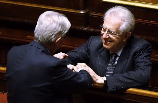 Il ministro per la Coesione Territoriale Claudio De Vincenti rende omaggio al presidente negletto Mario Monti: fu il Professore a portarlo al governo per la prima volta. E da allora non si è mai mosso da lì