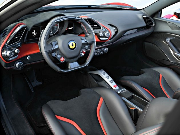 Peraltro la linea di fuga nera incorpora anche l’indicatore di direzione laterale (che quando è spento è praticamente invisibile), ed omaggia vetture iconiche come la GTO, F40 e F50: si tratta di un elemento che “altera la percezione della linea di cintura, fissandola di fatto a un’altezza decisamente inferiore rispetto al solito”. Il complesso creato da superfici vetrate e montati scuri genera un intrigante “effetto visiera”, già usato pure sulla one-off 458 MM e ripreso dalle barchette Ferrari da competizione del passato.