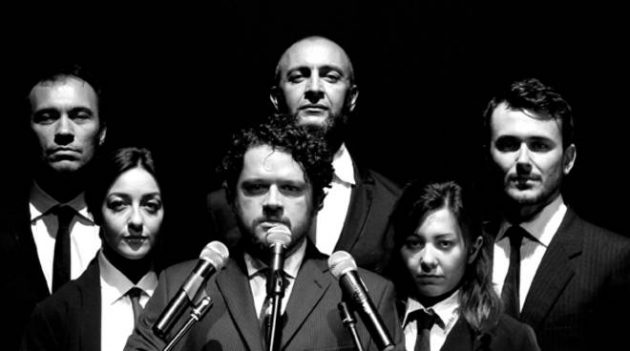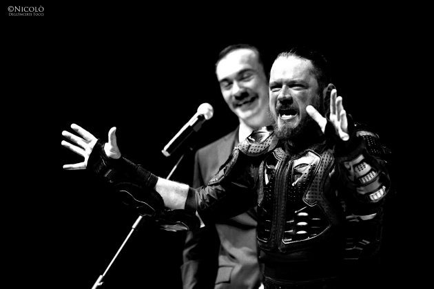 L’atmosfera alterna il concerto, pompato, techno dai bassi cupi e disco ritmato, al comizio, mentre intorno si muovono e sgambettano e saltellano tra il palco e la platea i personaggi in abito classico da Iene (segnaliamo Luca Cattani e Giusto Cucchiarini in un cast giovane ben amalgamato, pugnace e agguerrito), completo nero, come la cravatta e camicia bianca che ormai, nell’iconografia collettiva nostrana fa rima con onestà, con ricerca della verità, con lo scardinamento dei poteri forti, con il far venire a galla scomode realtà, con il non aver paura di scoperchiare vasi di Pandora nascosti, taciuti, insabbiati.