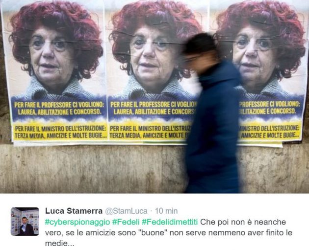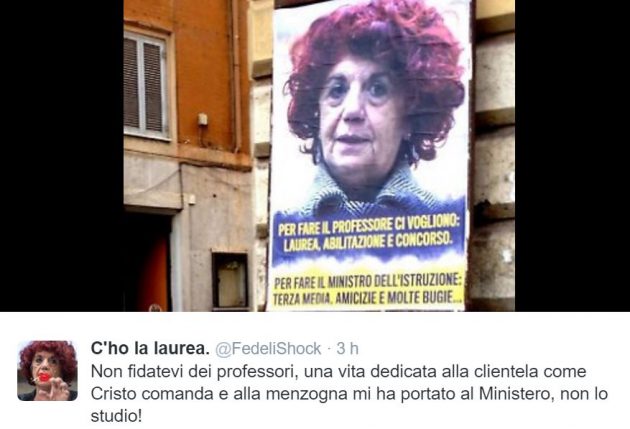 Una grande foto in primo piano del ministro dell’Istruzione e sotto la scritta: “Per fare il professore ci vogliono: laurea, abilitazione e concorso. Per fare il ministro dell’Istruzione: terza media, amicizie e molte bugie”. I muri di Roma sono stati tappezzati nella notte tra il 9 e il 10 gennaio con una seria di manifesti contro Valeria Fedeli. Un’iniziativa rimasta anonima, visto che sui cartelloni non c’è alcuna firma degli autori.
