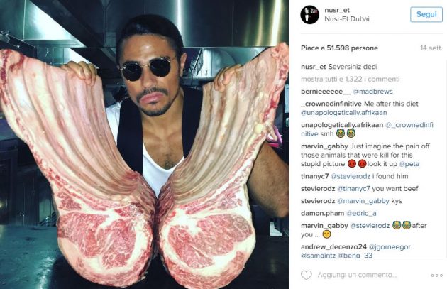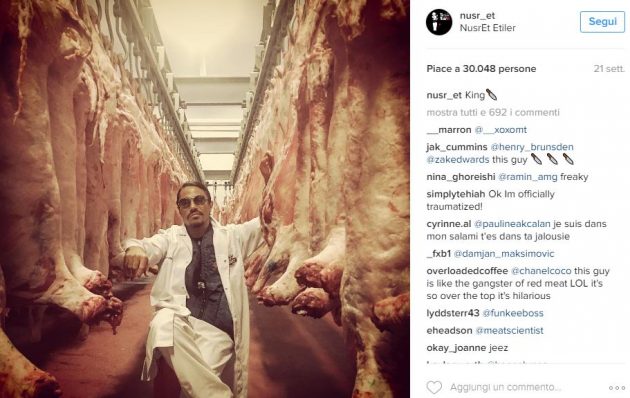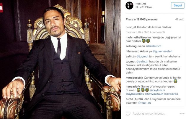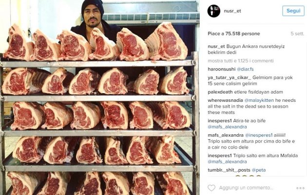 Fisico palestrato e tinta carboncino alla Fabrizio Corona, posa prorompente (e “altezza”) alla Jean-Claude Van Damme, corpo e viso immersi tra quarti di bue ed abnormi salsicciotti preconfezionati: ecco a voi Nusret Gokce, lo chef turco di umili origini, ora a capo di centinaia di dipendenti, che sta facendo spopolare il web. Niente di eccezionale tra i fornelli, se non l’abbondante “carnazza” che sembra offrire ai suoi parecchi e affezionati clienti della catena Nusr-et Steak House aperta fin dal 2010 e con sei locali dislocati tra Istanbul, Ankara e Dubai. Semmai Nus-ret sembra fare sfracelli sul web. Sulla sua pagina Instagram, presa d’assalto da un milione e mezzo di follower, ha costruito in pochi anni un’immagine accattivante, e per certi versi anche un po’ pacchiana, di cuoco piacione che accarezza fiorentine e filetti come fossero corpi di signora, e poi li sala nel suo celebre tocco con spolveratina di sale che scende dall’alto, e postura da torero, che online è finito per diventare sia un “meme” che un “hashtag” – #saltbae – cliccati fino allo sfinimento da due milioni di utenti.