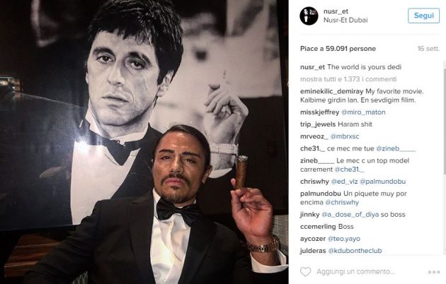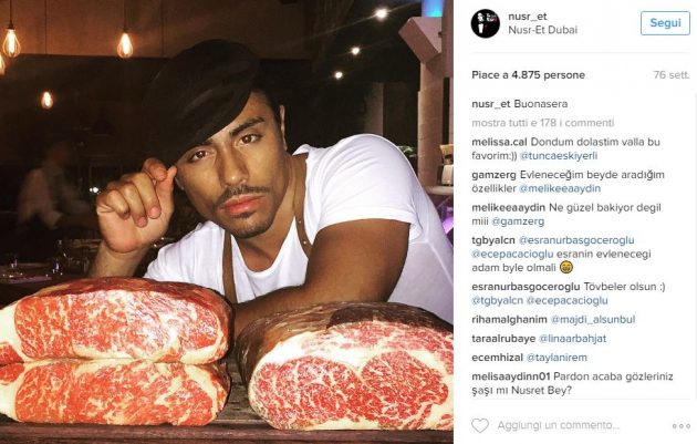 Nel suo locale ci sono finiti Fabio Capello e Roger Federer, Mesut Ozil, Antonio Banderas e Tommy Hilfiger; ma al di là degli scatti in cui si mette in posa fiera di fianco alle celebrity, quasi come fosse il proprietario di una qualsiasi trattoriola di provincia che accoglie cabarettisti e cantanti di Sanremo finiti fuori strada, Nusret #Saltbae è oramai icona pop del web perché ha saputo sfruttare i social come una qualsiasi star dello showbiz. C’è chi dice che a fargli fare il salto di popolarità sia stato un tweet del cantante R&B Bruno Mars, ma lo chef del Bosforo aveva realisticamente già toccato il cuore di molte fanciulle, e lo stomaco di parecchi carnivori, con filmati online in cui sussurra amabilmente alle pecore, si fa leccare sul naso dai manzi o massaggia le schiene delle sue mucche per poi un attimo dopo ritrovarsi a sferruzzarne i teneri lombi grigliati. Questione di gusti, si dirà, ma Nus-rat sembra essere nato quasi più per recitare che per cucinare. Basta guardare il menù della sua catena e capire che si tratta di un’enorme grigliata in famiglia con piccole variazioni di cottura, qualche polpettina, un cocktail di gamberi e un paio di insalatine giusto per far sedere qualche annoiata personalità turca.