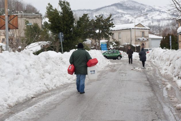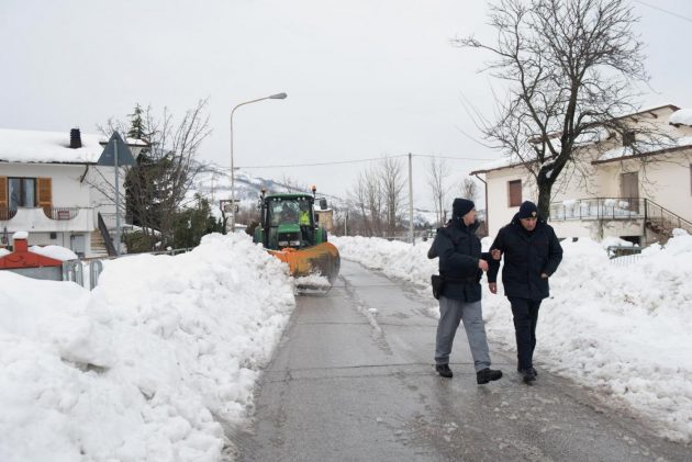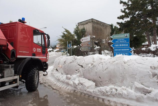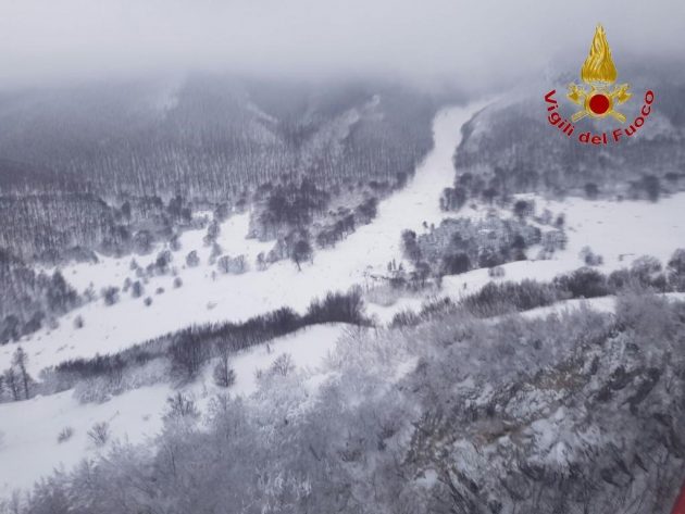 Troppa neve, impossibile andare avanti. Gli unici in grado di avvicinarsi sono i vigili del fuoco, con un elicottero e un cingolato per otto persone. Sono ore dove la neve si mischia alle macerie. Attorno alle 8 del mattino la turbina si ferma: è finito il gasolio. Le riserve ci sono ma sono un paio di chilometri indietro. Così una ventina di vigili del fuoco prede una tanica a testa e torna indietro a piedi nella neve, fa rifornimento dagli altri mezzi e torna indietro, consentendo alla macchina di ripartire. E arriva anche ‘il bruco’, un mezzo cingolato che può trasportare fino ad otto persone. La turbina riparte. Arrivano anche le unità cinofile che però non rilevano nulla. Davanti, ancora ad alcune centinaia di metri, c’è la slavina che ha coperto tutto. È quasi mezzogiorno quando la colonna imbocca l’ultimo chilometro, il più difficile. Gli alberi crollati sono ovunque e una nuova slavina rallenta ancora l’avanzata.