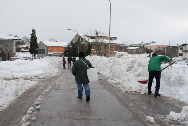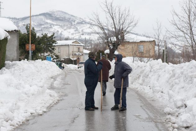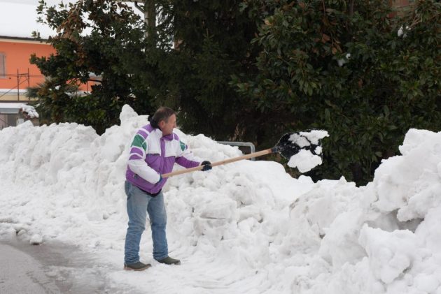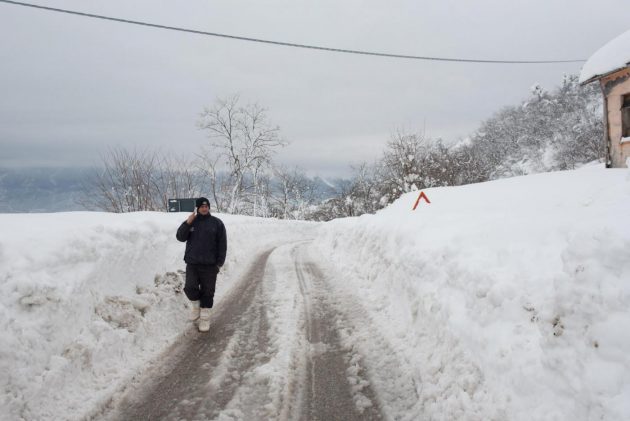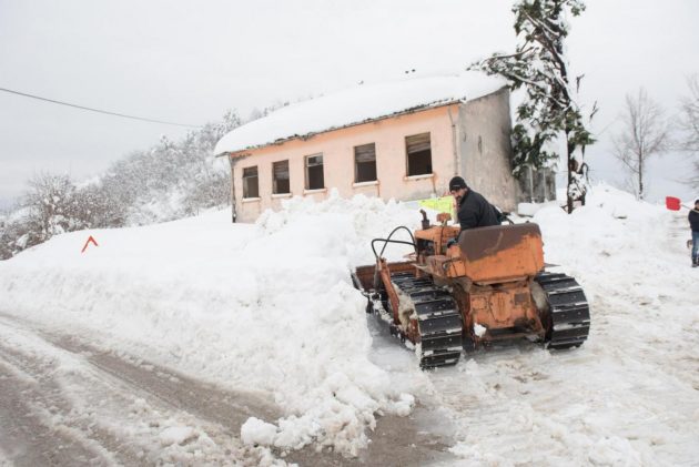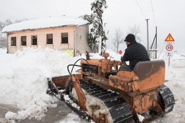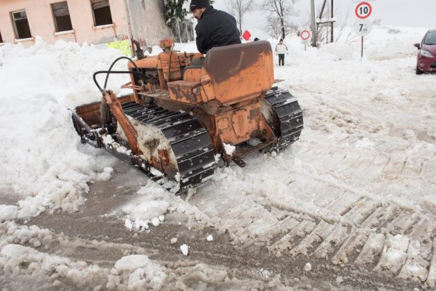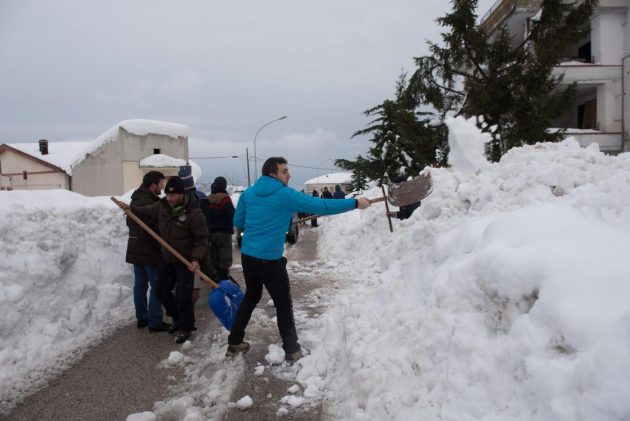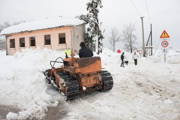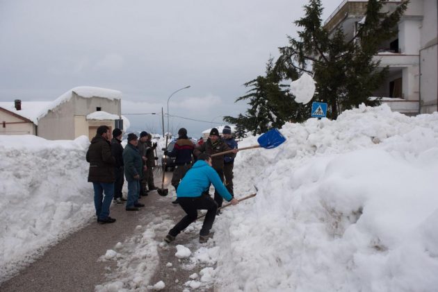 Ed è qui che inizia l’odissea, quella vera. Fatti i due primi tornanti, il muro di neve ai bordi della provinciale copre completamente i cartelli stradali; la strada è ridotta ad un’unica carreggiata: se passa qualcuno nel verso opposto bisogna fare centinaia di metri in retromarcia nella neve e, in diversi punti, gli alberi crollati per la troppa neve riducono ancora l’asfalto percorribile. Si decide così di fermare i mezzi pesanti, si va avanti solo con le campagnole. Ad aprire la strada è una turbina, una macchina che serve a strappare la neve dall’asfalto e spararla di lato.