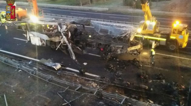 Al momento restano aperte tutte le ipotesi sulle cause della tragedia, anche quelle legate a un cedimento del mezzo o un malore del conducente. In tal senso, gli investigatori stanno vagliando diverse testimonianze, tra le quali quella di un camionista che una trentina di chilometri prima del luogo dell’incidente ha segnalato di aver visto una ruota del pullman avere qualche problema. Una segnalazione che, se confermata e al pari delle altre, potrebbe servire a rendere più chiaro quanto avvenuto. Sul posto, per tutta la notte, la polizia stradale di Verona e i vigili del fuoco, i primi ad arrivare sul posto. Davanti ai loro occhi scene raccapriccianti: alcuni dei ragazzi erano stati sbalzati fuori dal mezzo e i superstiti erano scossi e scioccati. Le condizioni dei corpi estratti dalla carcassa del pullman rendono particolarmente difficili le operazioni per l’identificazione delle vittime. I corpi sono in gran parte carbonizzati: sarà fondamentale l’esame del Dna. Al lavoro anche la polizia scientifica, che ha compiuto un attento esame anche all’interno del mezzo alla ricerca di ogni possibile traccia utile agli accertamenti in corso. L’attenzione degli inquirenti è concentrata anche nella raccolta e visione dei video della rete autostradale.