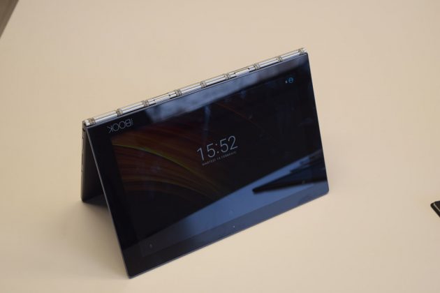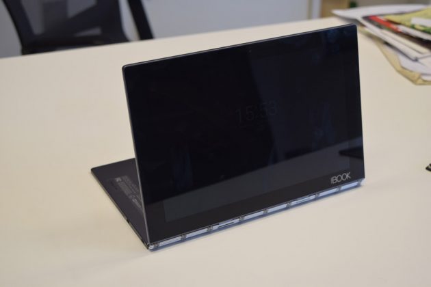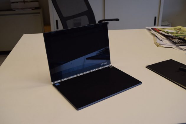 - la modalità navigazione, con schermo e tastiera totalmente aperti, praticamente con le due parti della scocca esterna a toccarsi, permette allo Yoga Book di essere utilizzato come un comune tablet o, rivolgendo verso l’alto la tavoletta, di prendere appunti, anche se ciò è più indicato con la versione Android che permette di farlo mantenendo il display spento, risparmiando sul consumo della batteria.