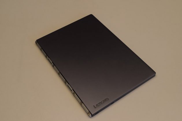 Dal punto di vista estetico il prodotto presenta la forma di un piccolo libro dove il dorso è sostitutito da una cerniera metallica a tre colonne – ciò che permette la rotazione a 360° dello schermo- ottenendo un look professionale, grazie al design sobrio ed ai materiali della scocca stessa (lega d’alluminio); una volta aperto attira sicuramente lo sguardo la comparsa della tastiera Halo. Lo Yoga Book pesa 690g, misura 256mm x 170mm ed ha uno spessore di 9,6mm, nella norma per un 2 in 1, è più spesso rispetto ad un normale tablet ma non lo si nota eccessivamente.
