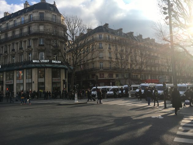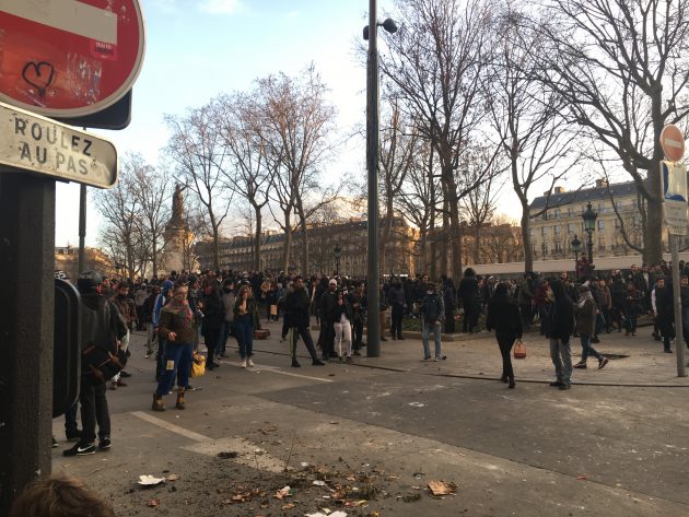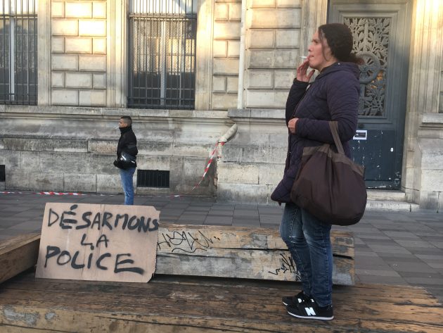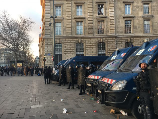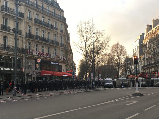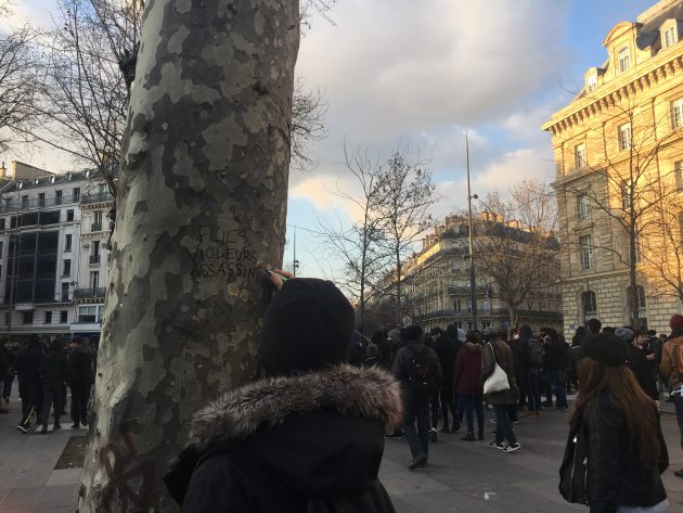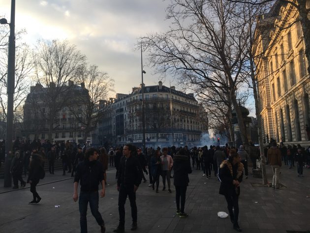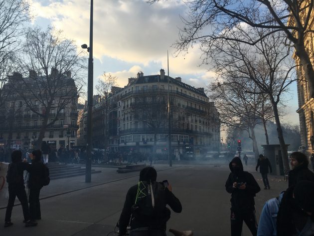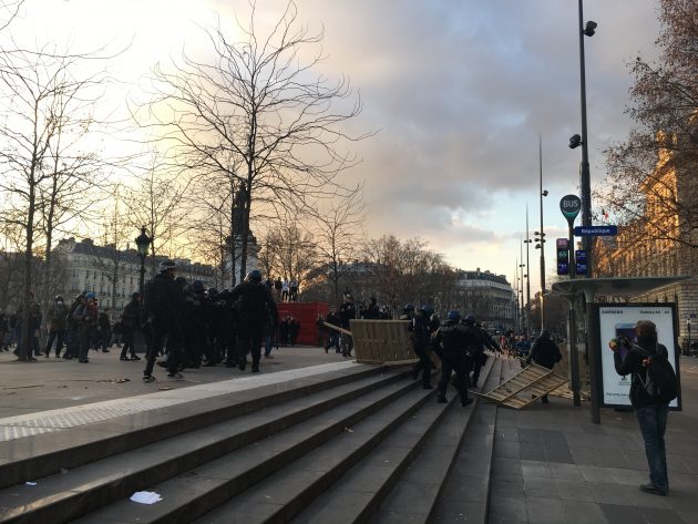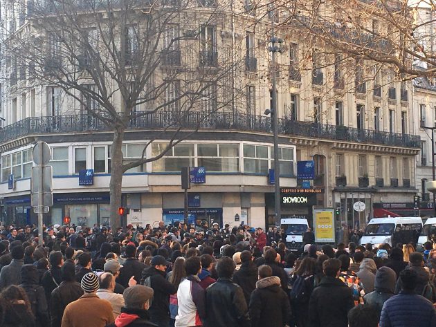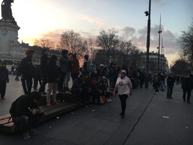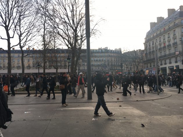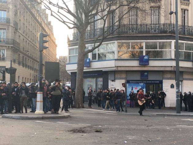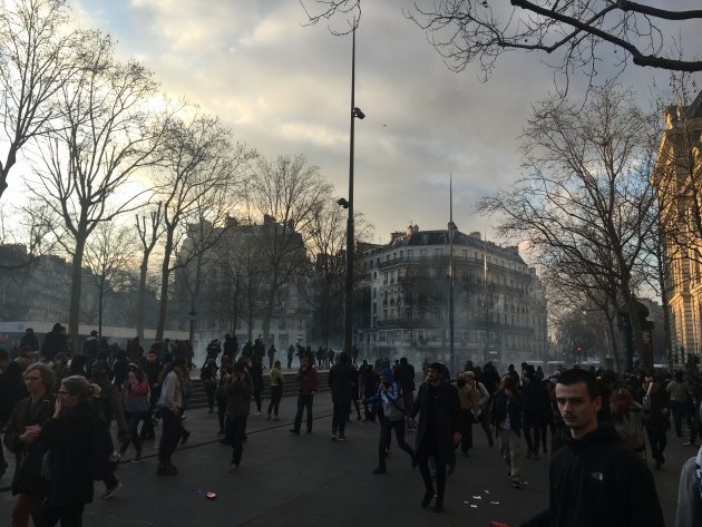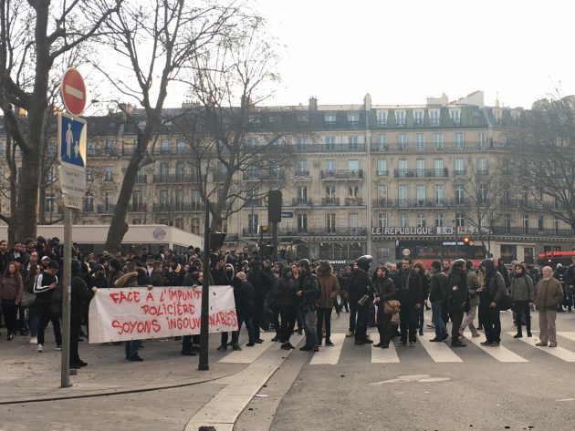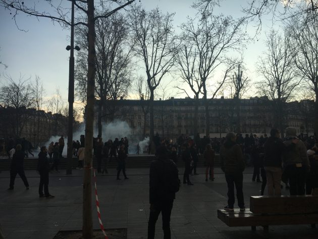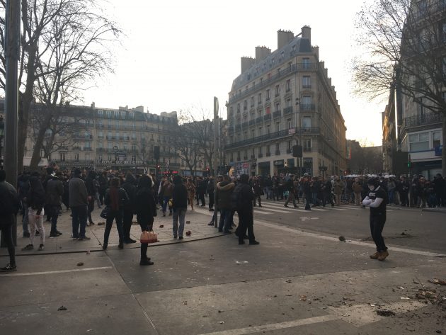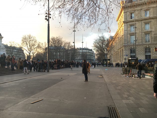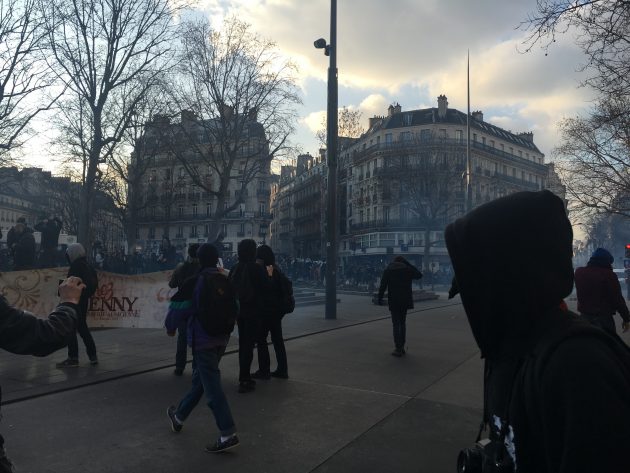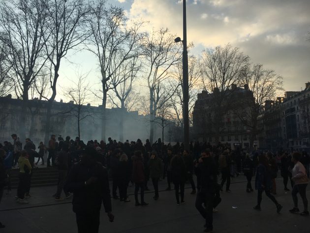 Per due ore Place de la République diventa un campo di battaglia. I sei ingressi principali sono murati da decine di camionette delle forze dell’ordine, la metropolitana chiusa e chi vuole entrare nella piazza deve superare i controlli a borse e zaini. I manifestanti si spostano da un angolo all’altro cercando di sfondare i blocchi: tirano pietre e oggetti, qualcuno fa scoppiare alcuni petardi. La gendarmeria prima carica e poi risponde con i lacrimogeni. Il gruppo corre al lato opposto della piazza, ma non basta. Per due ore si muovono come un’onda, avanti e indietro cercando di sfondare il muro degli agenti schierati. In prima linea fermi e quasi immobili ci sono quattro ragazzi con uno striscione: “Di fronte all’impunità della polizia, siamo ingovernabili”, è la scritta a pennarello rosso sul lenzuolo bianco. Mentre piovono oggetti, un uomo con la chitarra avanza da solo verso le forze dell’ordine e canta “Abbasso lo stato d’emergenza”. Fa prendere fiato agli altri che corrono al lato opposto della piazza.
