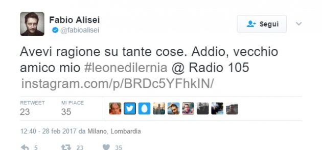Con poche parole sui suoi profili social, lo speaker radiofonico Fabio Alisei, suo vecchio compagno ne Lo Zoo di 105, ha annunciato la morte di Leone Di Lernia: “Avevi ragione su tante cose. Addio, vecchio amico mio”.