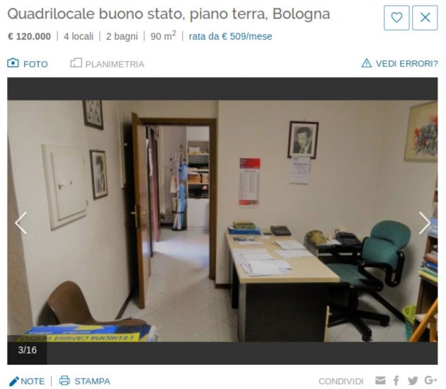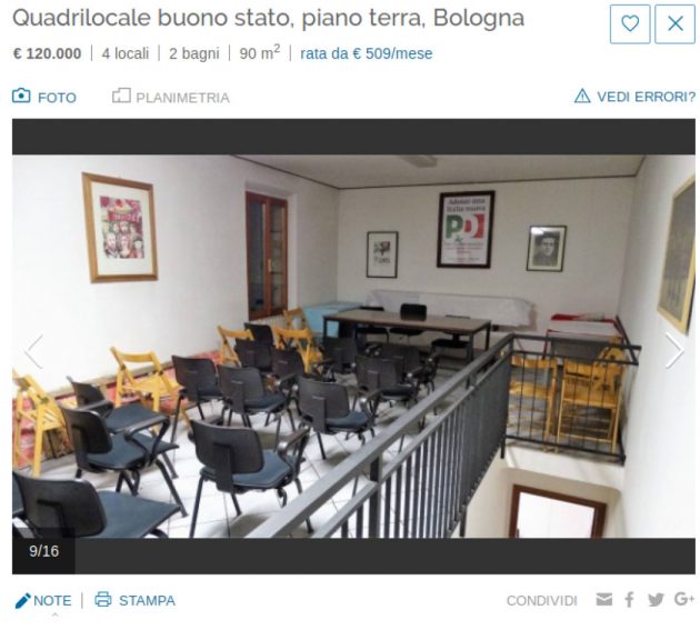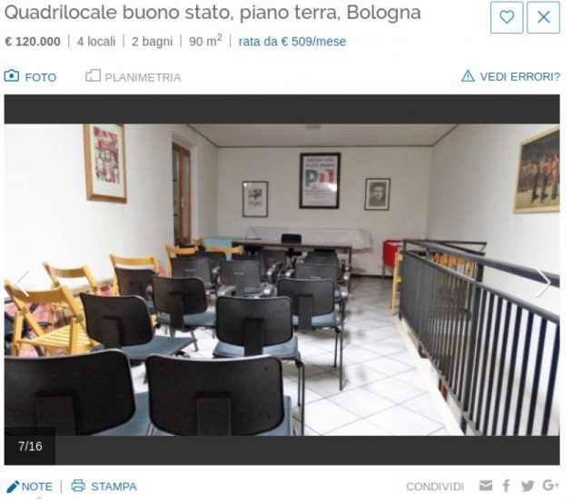 Prezzo: 120mila euro per 90 metri quadrati su due piani. “Ripartiamo da zero, un progetto da realizzare, una casa da plasmare, e da ristrutturare!” Non è una casa qualunque quella “da plasmare”, come recita l’annuncio immobiliare comparso qualche giorno fa sui più importanti siti di vendite appartamenti. È l’attuale sede del Partito democratico della Barca, quartiere popolare e operaio della rossa Bologna. Il partito è sempre più liquido, mai come oggi dopo la scissione dei bersaniani, e servono sempre meno sedi. A Bologna gli iscritti si sono dimezzati in tre anni, passando da 75mila a 35mila. Così si vende. Ma a colpire chi cerca casa e si imbatte nell’inserzione, sono le foto messe online dall’agenzia immobiliare: le sale con le bandiere, le foto dei leader storici della tradizione comunista. “Disponiamo di 77 mq, possiamo ricavare con una semplice modifica: una sala, una cucina abitabile, 2 camere, 2 bagni già esistenti, uno al piano sopra e uno al piano terra”, recita l’annuncio.