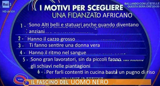 Proprio come per le donne dell’Est Europa, anche qui abbondano i luoghi comuni. Per esempio, perché scegliere un fidanzato africano? È presto detto: “sono alti, belli e statuari anche quando diventano anziani” oppure, e citiamo testualmente, “hanno il cazzo grosso”. Immancabile l’evergreen “hanno il ritmo nel sangue” o, ancora, “Sono gran lavoratori, sin da piccoli fanno gli schiavi nelle piantagioni” e “Per farli contenti in cucina basta un pugno di riso”.