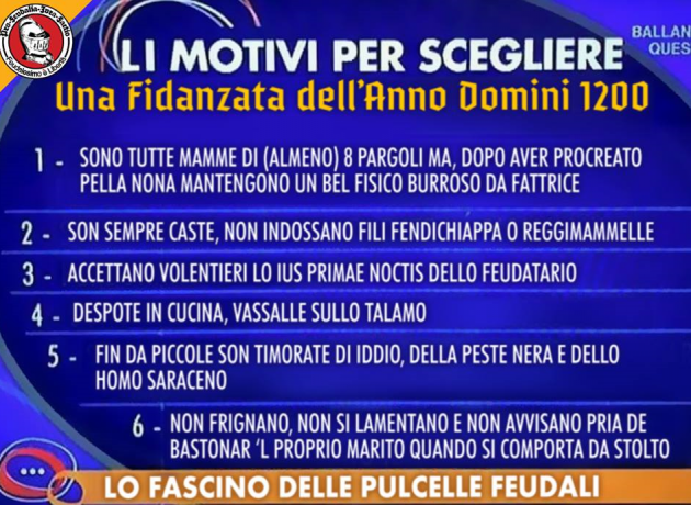 Infine, spazio anche ai cavalieri senza macchia che sognano una pulzella dai modi medievali, con i motivi della nota pagina satirica “Feudalesimo è Libertà” per scegliere una fidanzatta dell’anno domini 1200: