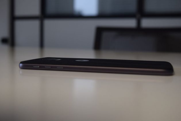 La cornice esterna è quasi interamente in alluminio: viene interrotta in alto da una fascia per le antenne, da un microfono e dal cassettino per SIM e microSD (possono essere inserite 2 Sim o 1 Sim e 1 microSD). Sul lato destro in alto trovano posto due pulsanti indipendenti per il volume ed il pulsante d’accensione (quest’ultimo zigrinato), infine in basso trova posto l’unico connettore presente sul dispositivo, una porta USB-C da utilizzare per la ricarica, il trasferimento dati e per gli auricolari (a corredo dello smartphone viene dato un adattatore per utilizzare le cuffie standard da 3,5mm ).