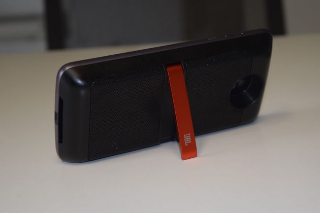 Il JBL SoundBoost permette di dotare i Moto Z di due speaker stereo da 27mm con 3W di potenzia ciascuno, sopperendo al non potentissimo singolo speaker integrato. La mod targata JBL integra una batteria da 1000mAh. Pesa 115 grammi, è spessa 13 millimetri e dota lo smartphone di un piedino d’alluminio per tenerlo in posizione rialzata. L’audio riprodotto è di buona qualità e dà particolare risalto ai bassi. In più, non presenta distorsioni nemmeno portando il volume al massimo. Il JBL SoundBoost viene venduto a 89 euro: un prezzo sicuramente superiore o pari ai vari speaker bluetooth disponibili sul mercato, che però non richiede nessuno sforzo per l’accoppiamento. Allo stesso tempo, però, ha lo svantaggio di poter essere utilizzato solo dai Moto Z.