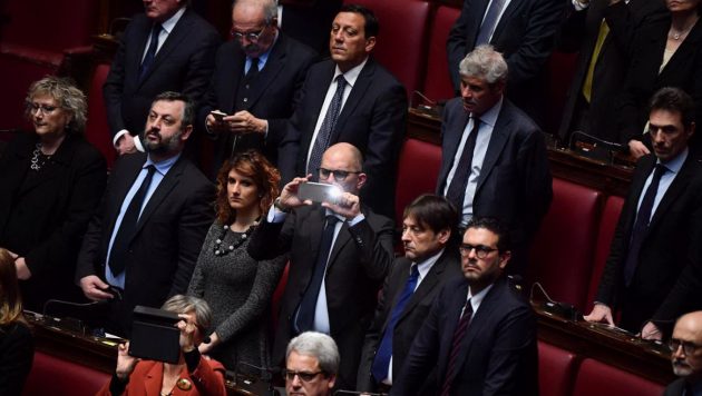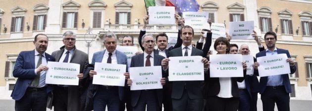In Aula a Montecitorio erano circa 30 gli esponenti del M5s presenti (in totale gli eletti sono circa 120). I Cinquestelle hanno partecipato alle due standing ovation per il presidente Mattarella. Il capogruppo alla Camera Vincenzo Caso non si è alzato né ha applaudito in entrambe le occasioni così come un altro paio di colleghi di partito. Non c’era proprio, invece, la Lega Nord, che invece ha organizzato un sit in fuori dal palazzo di Montecitorio. I parlamentari del Carroccio hanno esposto cartelli con su scritto: “Europa uguale più disoccupati”, “No all’Europa dei traditori”, “Questa Europa affama i popoli”. “Rispettiamo il presidente Mattarella – osserva il capogruppo Massimiliano Fedriga – ma oggi non c’è nulla da festeggiare. Stanno festeggiando i traditori dei valori europei, chi sostiene un’Europa che massacra i diritti dei cittadini europei, l’economia degli Stati, che fa gli interessi delle lobby finanziarie. Ormai l’uscita dall’Euro non è più una scelta ma una via obbligata per risollevare le economie depresse dei nostri Paesi”. In realtà qualcuno della Lega alla Camera c’era e non una figura da poco: il fondatore del partito Umberto Bossi: “Preferisco sempre sentire le cose per poi ragionarci”.