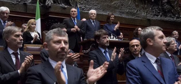 “Oggi l’Europa appare quasi ripiegata su se stessa. Spesso consapevole, nei suoi vertici, dei passi da compiere, eppure incerta nell’intraprendere la rotta. Come ieri, c’è bisogno di visioni lungimiranti, con la capacità di sperimentare percorsi ulteriori e coraggiosi”. E’ uno dei passaggi del discorso alla Camera del presidente della Repubblica Sergio Mattarella davanti al Parlamento in seduta comune e agli europarlamentari italiani per la celebrazione dei Trattati di Roma. Alla cerimonia non partecipano i parlamentari della Lega Nord (che hanno organizzato un sit-in in piazza Montecitorio), ma è presente il fondatore del partito, Umberto Bossi. Sono presenti – insieme agli altri gruppi – gli eletti del Movimento Cinque Stelle. Mattarella ha ricevuto una lunga “standing ovation” una volta entrato nell’Aula di Montecitorio per il suo discorso: prima che il capo dello Stato iniziasse il suo intervento tutti i presenti nell’emiciclo si sono levati in piedi ed hanno battuto le mani a lungo. “Costruire il futuro richiede all’Italia e all’Europa una straordinaria unità d’intenti e una solida fiducia nei valori fondanti del processo di integrazione – ha sottolineato il presidente tra le altre cose – Non impossibili ritorni a un passato che non c’è più, non muri che scarichino i problemi sugli altri senza risolverli, bensì solidarietà fra Paesi, fra generazioni, fra cittadini che condividono una stessa civiltà”. Per Mattarella, dunque, serve parafrasare un vecchio motto della politica: “Capovolgendo l’espressione attribuita a Massimo d’Azeglio verrebbe da dire: ‘Fatti gli europei è ora necessario fare l’Europa’. Sono le persone, infatti, particolarmente i giovani, che già vivono l’Europa, ad essere la garanzia della irreversibilità della sua integrazione. Verso di essi vanno diretti l’attenzione e l’impegno dell’Unione”. Tuttavia il presidente ha sottolineato la necessità di una “riforma dei trattati”. L’intervento di Mattarella, durato circa 20 minuti, è stato interrotto da diversi applausi e la sua conclusione è stata salutata con una lunga standing ovation. “Ogni qual volta abbiamo – singolarmente o collettivamente – dimenticato questa spinta ideale, abbiamo contribuito a trasformare un grande progetto politico in un programma tecnico-burocratico nel quale i cittadini europei stentano, talvolta, a riconoscersi. La congiuntura economico-finanziaria ha lacerato il tessuto sociale dei nostri Paesi, mentre, alle nostre porte, instabilità diffusa e fenomeni di portata epocale hanno messo in crisi la capacità dell’Europa di rispondere alle aspettative dei suoi cittadini”.