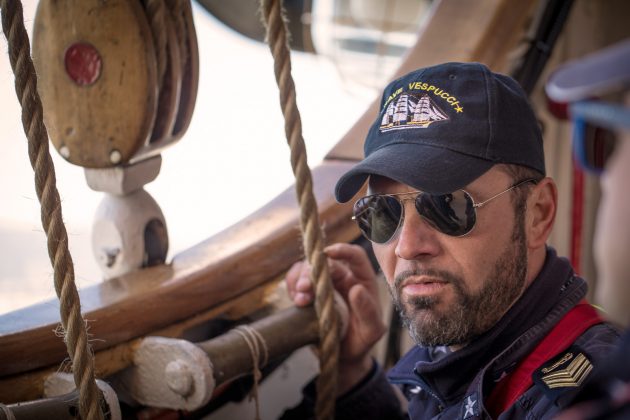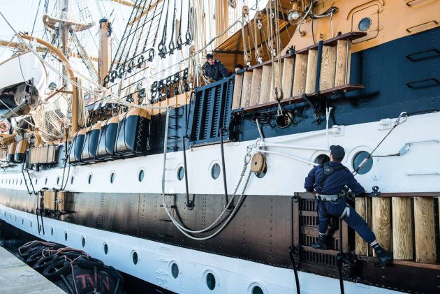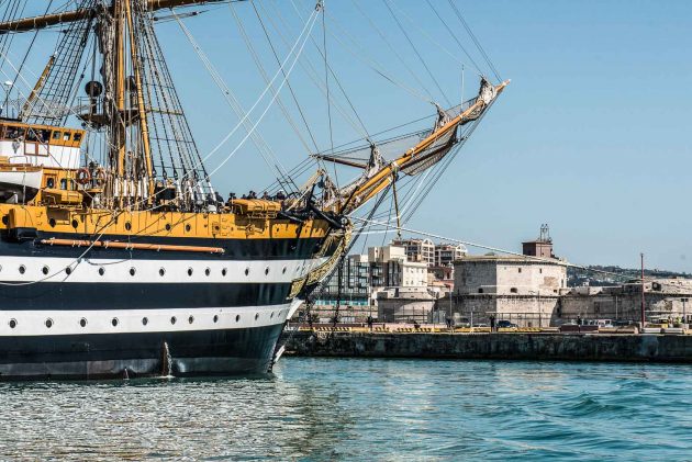 Il metro della sua bellezza è l’emozione sempre viva che si prova incrociandola in mare, oppure all’ormeggio. L’Amerigo Vespucci è la nave più bella del mondo, ma non è solo per una questione estetica, certo si rimane incantati dalle fasce bianche in corrispondenza dei ponti di batteria che ricordano le due linee di cannoni di un vascello ottocentesco, oppure dai fregi di prora o l’arabesco di poppa, in legno ricoperti di foglia d’oro zecchino, per non parlare dalla polena che raffigura l’effige del grande navigatore da cui prende il nome, ma nella nave delle meraviglie c’è di più. C’è quell’arte marinaresca, quel legame con il mare che noi italiani abbiamo nel dna e che il mondo ci riconosce e ci invidia
