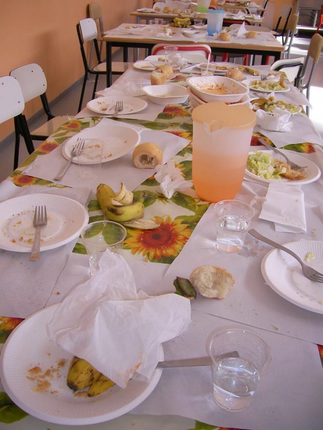 La pausa pranzo dura dalle 12:30 alle 13:30 in mensa, poi si va tutti in palestra o in giardino fino alle 14:30. Tutti i bambini continuano ad alimentarsi secondo coscienza e fabbisogno giornaliero: i piatti a fine pasto sono sempre vuoti e riordinati per non far perdere tempo alle cuoche. Dopo il pranzo così arrivano gli operatori della Caritas parrocchiale per prendere il cibo avanzato. “Non conosciamo direttamente le famiglie a cui vanno i pasti, ma so per certo che ce ne sono alcune anche della scuola”, spiega Giampiero.