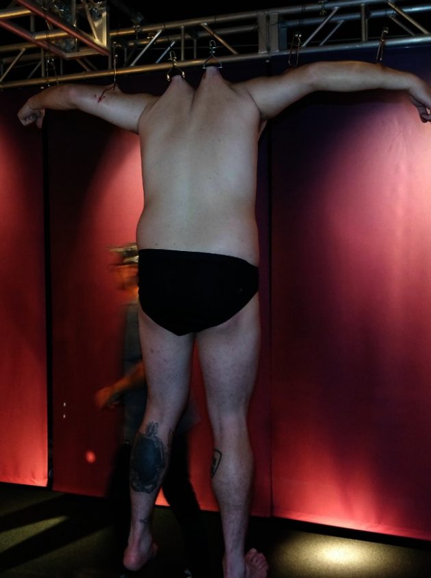 Le sospensioni multiple proposte dalla kermesse dedicata al corpo umano sono da guinness dei primati: risalgono a un’antica pratica che permette ai performer di rimanere per molto tempo appesi a peso morto, con i ganci metallici conficcati nello strato più esterno dell’epidermide. Una tecnica che richiede una fortissima concentrazione e grande forza fisica per essere eseguita, annunciata fra le attrazioni presentate in esclusiva al pubblico laziale nel primo weekend perché eseguita sospendendo il peso di più performer contemporaneamente sugli stessi ganci.