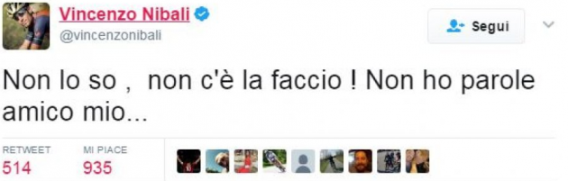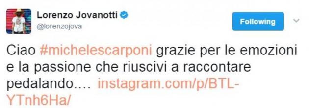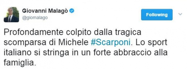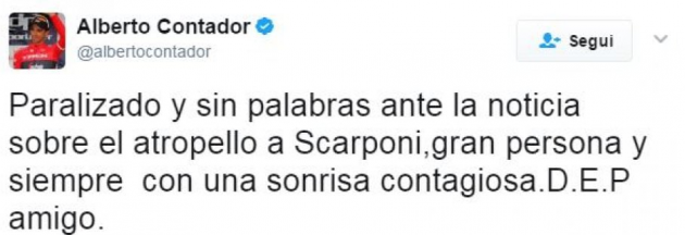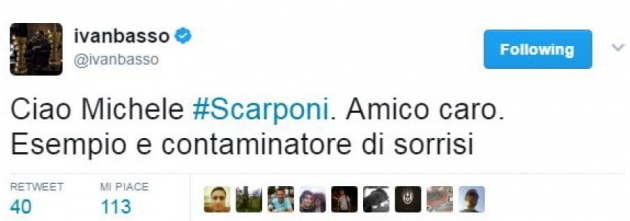 “Il mondo dello sport piange la scomparsa di Michele Scarponi – scrive il Milan sul proprio profilo Twitter – tutto il popolo rossonero si unisce alla famiglia e ai suoi amici”. Dai rossoneri alla Lazio: “Una tragedia che ha colpito il mondo dello sport, ci ha lasciato Michele Scarponi. La Lazio si unisce al cordoglio della famiglia”. Anche il Genoa non manca all’appello: “Siamo vicini alla famiglia e al lutto del mondo del ciclismo per la tragica scomparsa di Scarponi”.