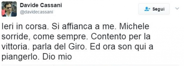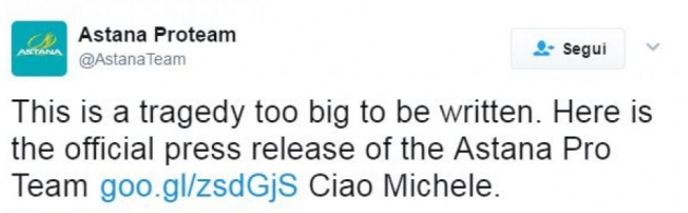 E’ finita a soli 37 anni la vita di Michele Scarponi: il marchigiano è stato travolto da un furgone questa mattina mentre si stava allenando sulle strade di casa. E il mondo dello sport, in particolare campioni del ciclismo e diversi club di calcio, ha voluto commemorarne la scomparsa. Francesco Totti si dice “vicino alla famiglia di Michele Scarponi. Una tragedia che tocca tutto lo sport italiano”. Anche l’Inter, squadra di cui il ciclista era tifoso, ha voluto esprimere le proprie condoglianze: “Il nostro cordoglio e l’abbraccio ai tuoi cari in una giornata tristissima per lo sport. La tua Inter ti saluta con affetto! #Scarponi #FCIM“. Sono comunque tanti i club della Serie A che hanno voluto ricordare il campione scomparso questa mattina alle porte di Ancona.