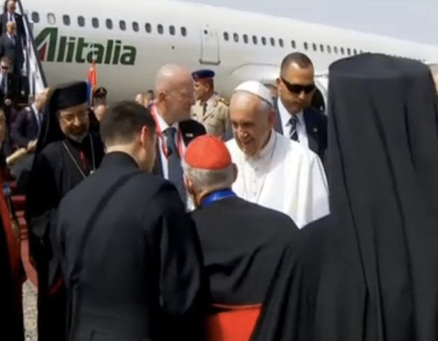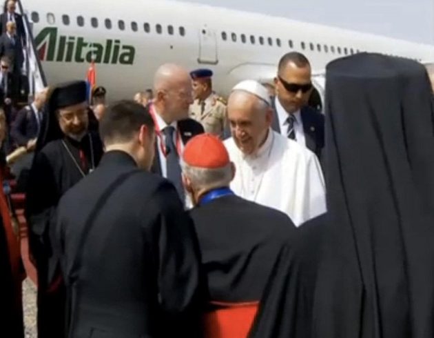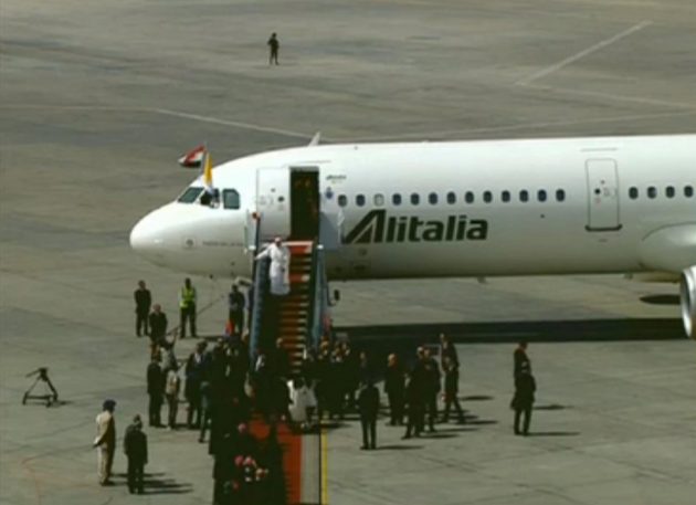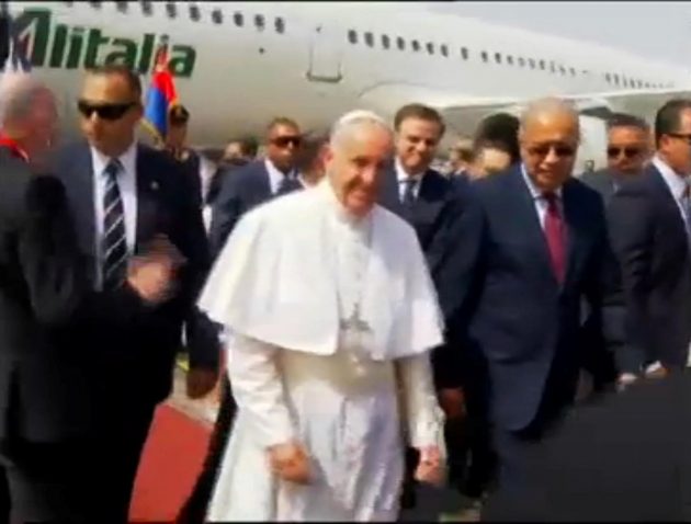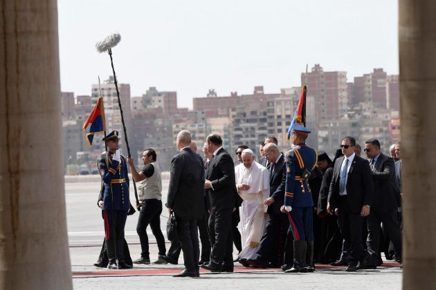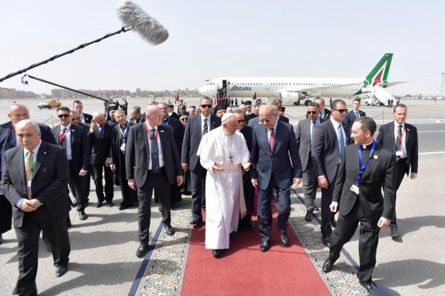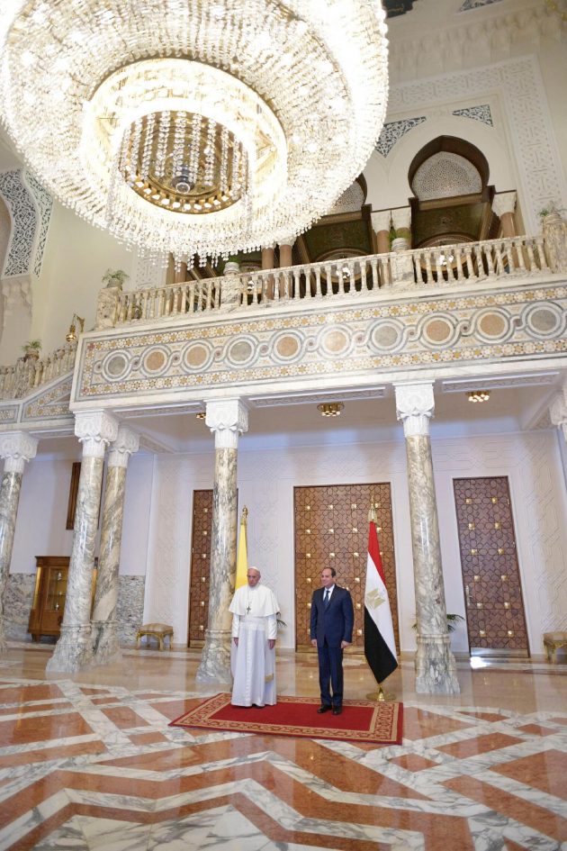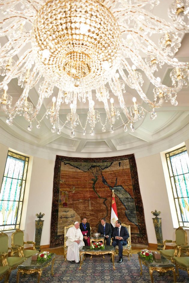 Arrivato al Cairo poco dopo le 14 su un aereo Alitalia il Papa è stato accolto dal premier egiziano Sherif Ismail, dal patriarca di Alessandria dei copti cattolici Ibrahim Isaac Sedrak, dal nunzio apostolico monsignor Bruno Musarò, dal vescovo di Luxor monsignor Emmanuel Bishay e dal segretario della Nunziatura apostolica Jan Thomas Limchua. “Questo viaggio ha un’aspettativa speciale perché è stato fatto per l’invito del presidente della Repubblica, del Papa Tawadros II, patriarca di Alessandria dei Copti, e del Grande Imam di Al Azhar“, ha ricordato Bergoglio, prima di dirigersi – a bordo di una normale automobile visto che il pontefice non ha voluto utilizzare un’auto blindata – in direzione del palazzo presidenziale di Ittihadiya al Cairo. È lì che il Papa e Al-Sisi hanno tenuto il loro colloquio privato.