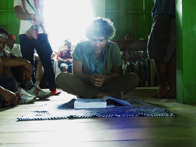 Mauro Villone – Ernesto Neto, in Rio Jordão (Acre) illustra il suo libro agli Huni Kuin.