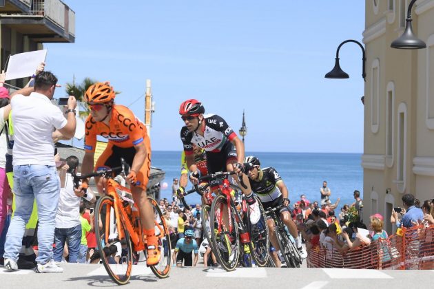 Con la macchina del tempo torniamo al presente che alla partenza di Montenero di Bisaccia metteva in fila almeno 17 possibili protagonisti raccolti in meno di un minuto, dalla maglia rosa Jungels a Rui Costa.