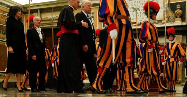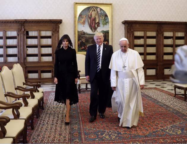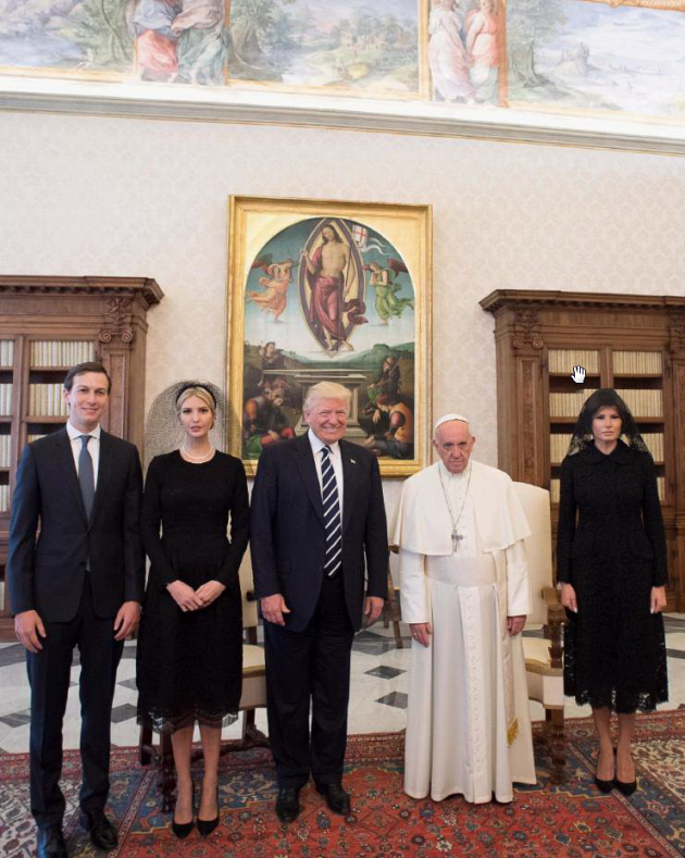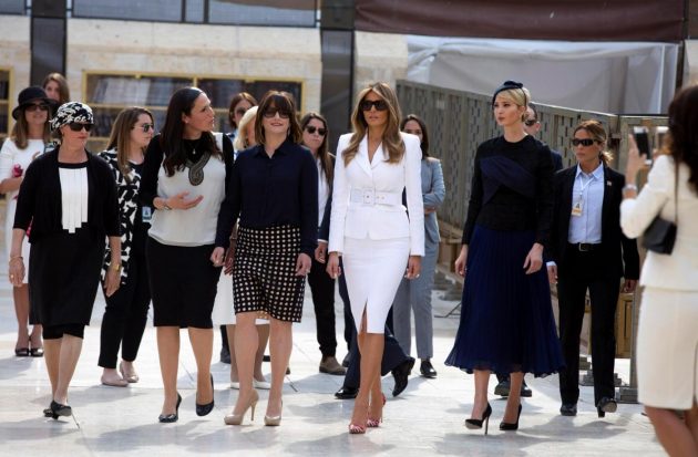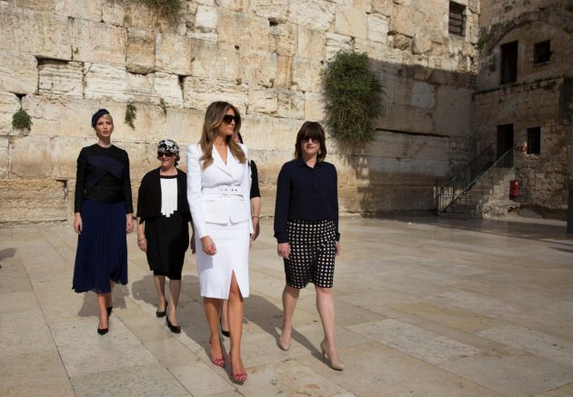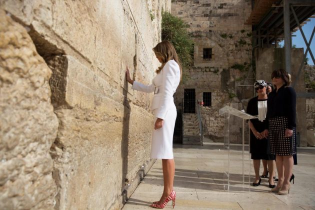 La scelta di Melania tuttavia appare più inconsueta se si confronta la mise che ha scelto a Gerusalemme con il castigato abito nero indossato a San Pietro: per visitare un luogo sacro come il Muro del Pianto Melania indossava un completo bianco stretto in vita da una cintura, scarpe con il tacco rosse e portava i capelli sciolti. Più sobria Ivanka, con un lungo abito blu notte e un cerchietto con velo sui capelli raccolti. A San Pietro invece la First Lady, nata in Slovenia, Paese a maggioranza cattolica, ha optato per una scelta decisamente più convenzionale, dimostrando di conoscere perfettamente l’etichetta. Gli uomini devono indossare un completo scuro, per le consorti è preferibile il nero, e inoltre hanno l’obbligo di coprire le gambe almeno fin sotto il ginocchio, coprire il capo e, va da sé, moderare le scollature. Sono ammessi gli abiti tradizionali e un piccolo scambio di regali. I gioielli devono essere sobri ma è consentito un filo di perle, che infatti compariva al collo di Ivanka.