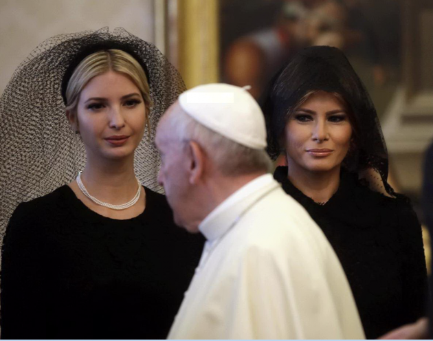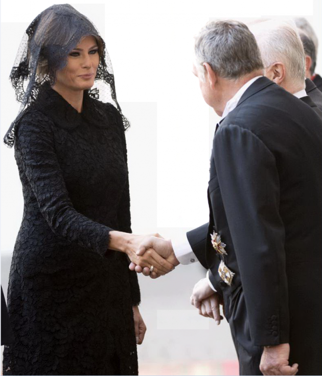 Abito nero in macramè, capelli raccolti e velo ricamato sul capo: Melania Trump si è presentata all’udienza papale rispettando alla perfezione il rigido protocollo del Vaticano. Una scelta estremamente rispettosa della tradizione, soprattutto se confrontata con la “libertà” che Melania ha mostrato viaggiando in Arabia Saudita e in Israele, dove non ha mai indossato il velo, nemmeno al Muro del Pianto. Era presente anche Ivanka, figlia di primo di letto del marito Donald: anche per lei abito scuro, l’irrinunciabile tacco a spillo e un elaborato velo sui capelli, fermato da un cerchietto.