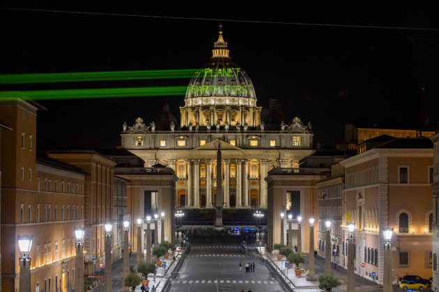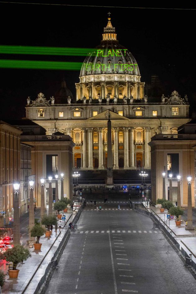 Alla vigilia dell’incontro tra Papa Francesco e Donald Trump, Greenpeace ha proiettato sulla cupola della Basilica di San Pietro il messaggio “Planet Earth First!” (Prima il pianeta Terra!”) in risposta al motto di Trump “America First!”. Il presidente degli Stati Uniti ha recentemente abolito numerose misure per la protezione del clima, desiderando favorire le aziende petrolifere e del carbone. Gli Usa sono il secondo emettitore di gas serra al mondo, superati solo negli ultimi anni dalla Cina.
