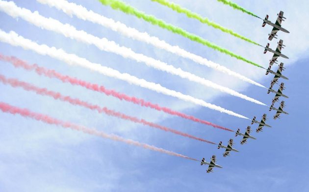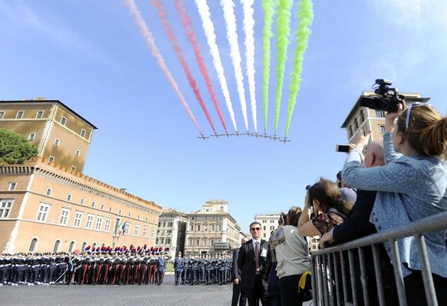 Alla termine della parata le Frecce tricolori hanno sorvolato i Fori Imperiali, segnando il cielo azzurro di Roma di verde, bianco e rosso. Novità di quest’anno, l’inno nazionale cantato da Andrea Bocelli, che si è detto “fiero di partecipare”: si è esibito insieme al coro di voci bianche dell’accademia nazionale di Santa Cecilia, accompagnato dalla banda interforze della Difesa. Gli onori finali al presidente della Repubblica sono stati resi dal reggimento dei corazzieri a cavallo e dalla fanfara dei carabinieri a cavallo.