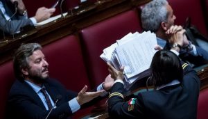 I faldoni con gli emendamenti alla legge elettorale consegnati sui banchi dei centristi di Idea e Udc. Nella foto gli ex ministri Giampiero D’Alia e Gaetano Quagliariello