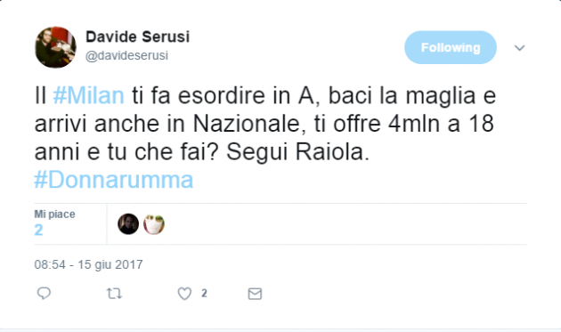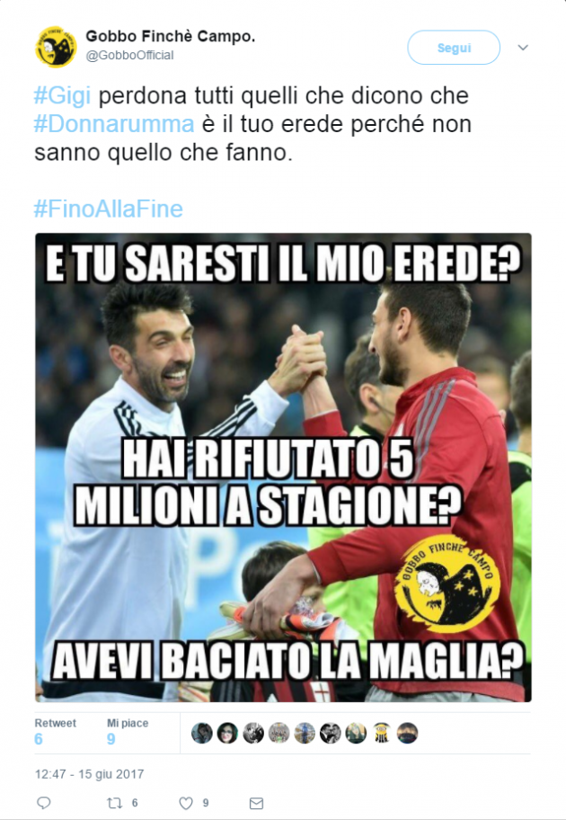 Delusi i tifosi, sopratutto per le dichiarazioni d’amore di ‘Gigio‘ verso la maglia rossonera. Fan scatenati sui social, soprattutto su Twitter, dove hanno sfogato la propria indignazione; ma c’è anche chi pensa che sia tutta opera di Raiola, manager italo- olandese capace di dettare legge nel calciomercato.