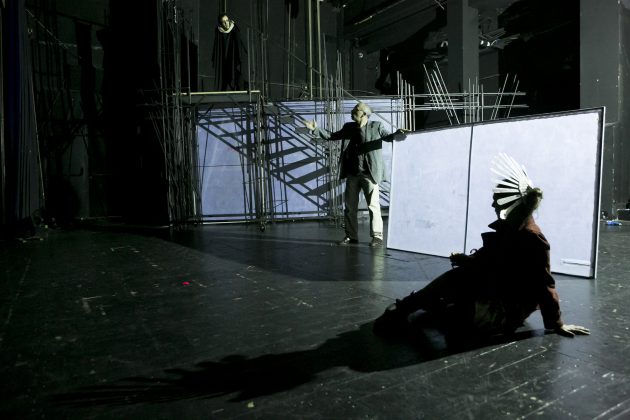 Alle loro spalle, una “nave” di impalcature (di Federico Biancalani che sposa le idee con un artigianato ispirato) o cantiere con transenne da lavori in corso con fili d’acciaio esposti, cavi che spuntano e s’issano al cielo che tanto somiglia a quelle abitazioni del Sud dove, in attesa delle nozze dei figli, si lasciano i tralicci ad arrugginirsi al sole. Sopra la scritta di protesta da writer di periferia Non s’ha da fare che nel corso della pièce perde quella negazione di tre lettere. Una voce fuori campo, al lato del boccascena, che cuce le scene, racconta e spiega e leggeva parti del romanzo appesantisce l’incantesimo del palcoscenico in modo didascalico e pedante. Renzo (Donato Paternoster c’è) è forte, duro, combattivo e protettivo e non si fa mettere i piedi in testa, Lucia (Giulia Eugeni, troppe volte le scappa il marchigiano) è in pattini in linea (come Silvia Calderoni dei Motus) e ha una corona-trina-aureola che al buio s’illumina. Leggermente retorico, ma funzionale il video dove i due amanti fuggitivi raccontano l’amore per la propria terra e il dolore nel doverla lasciare; accanto alle loro voci, quelle di migranti da ogni parte del mondo che, leggendo pezzi manzoniani, ci ricordano il parallelo tra il letterario e il reale, l’antico e l’oggi.